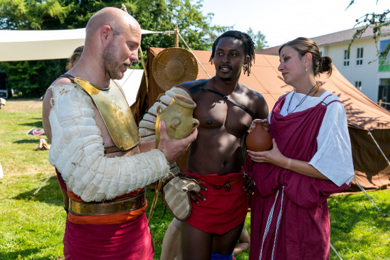 Die Darsteller der Reenactment Gruppe geben Erklärungen zum Militärstab und spannende Einblicke in das Lagerleben der römischen Truppen.