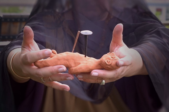 • Eine verschleierte Frau hält eine Tonpuppe eines Menschen in den Händen, in der ein Nagel steckt